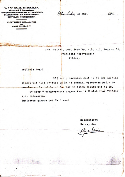 • Mededeling uit 1913 Van Ekris Breukelen