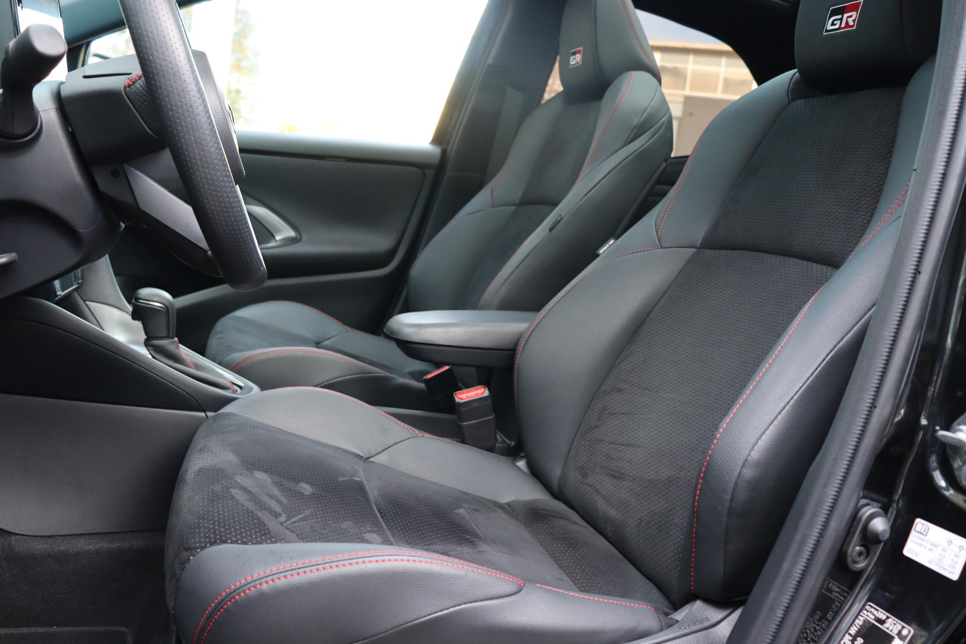 Suede bekleding met rode stiksels