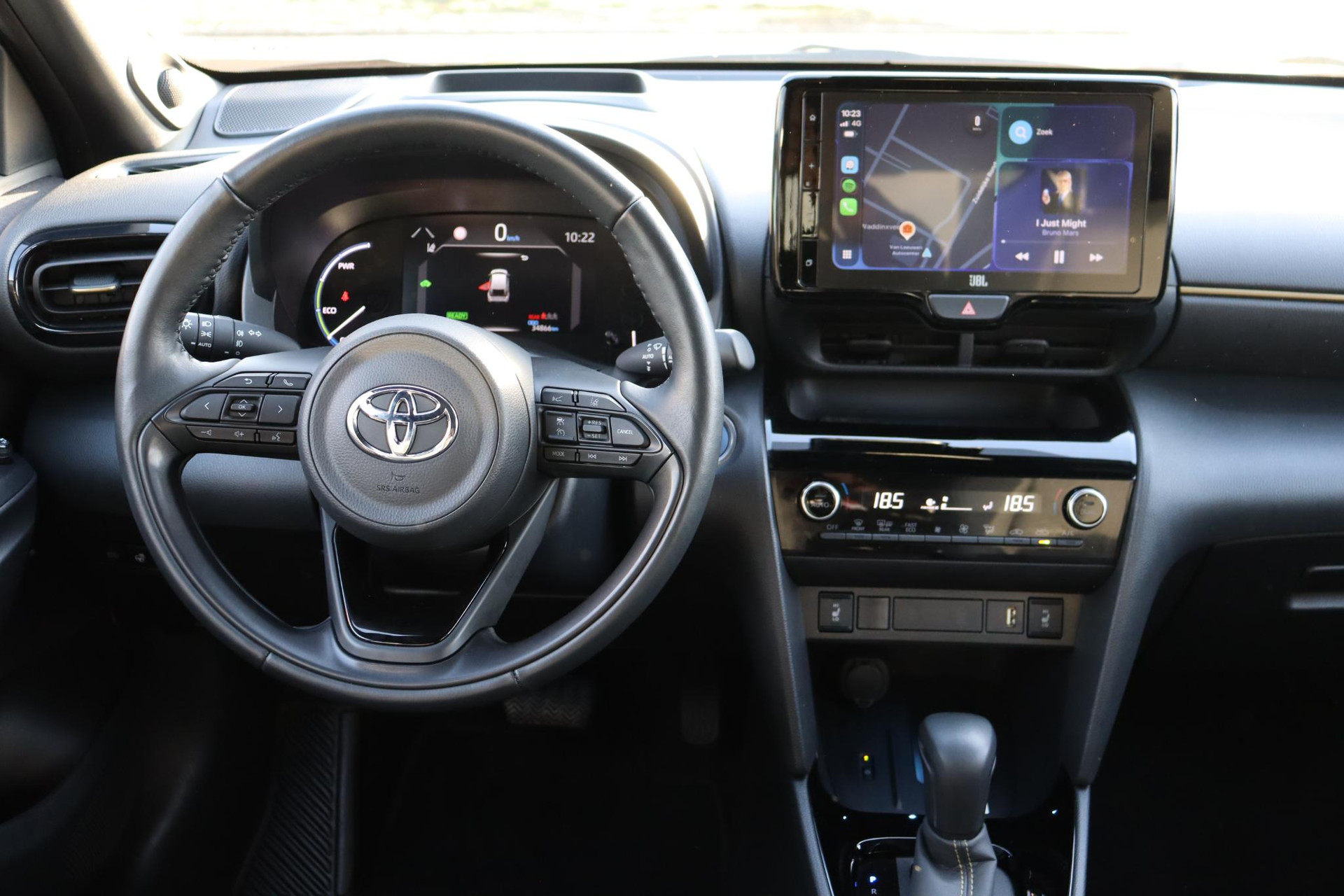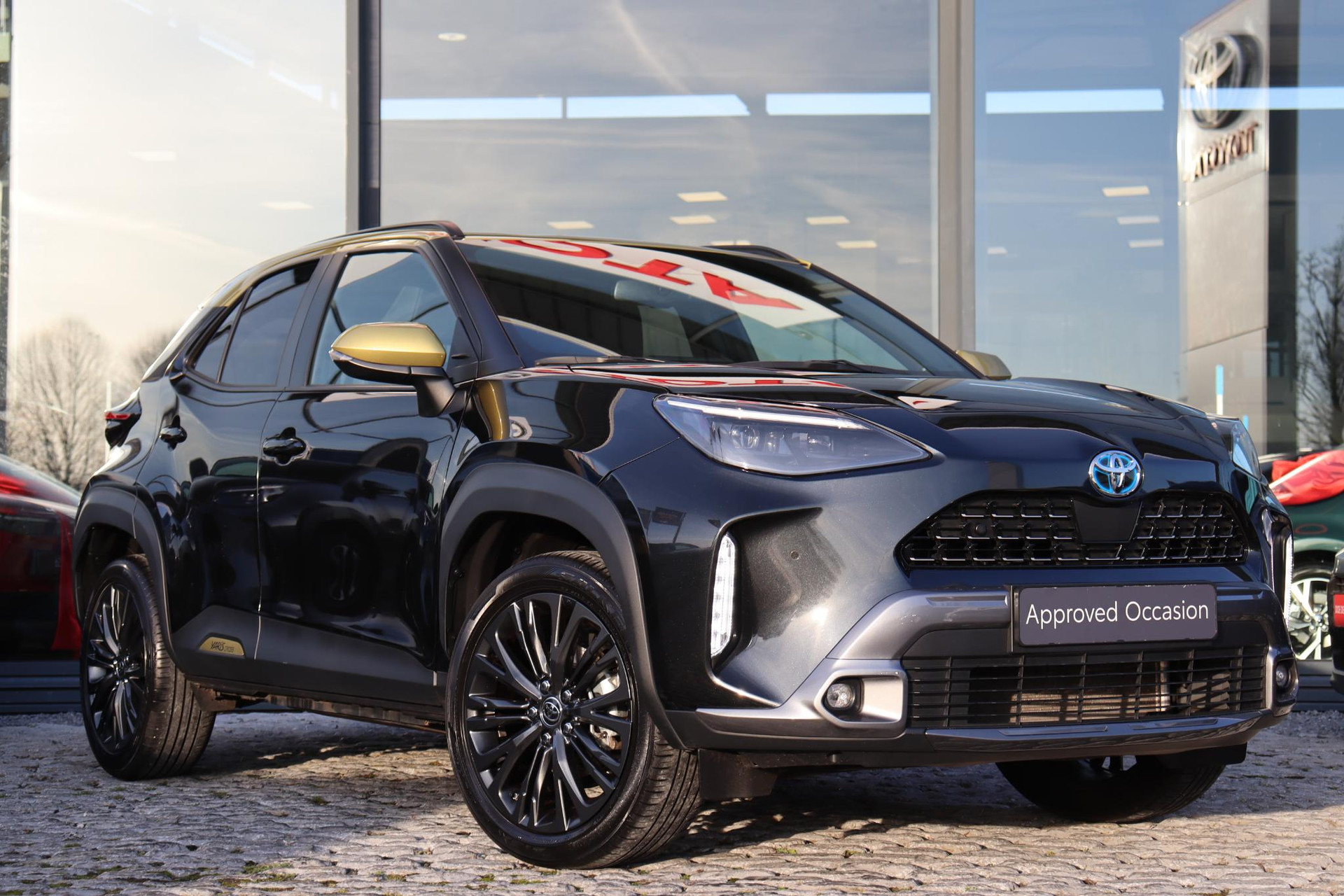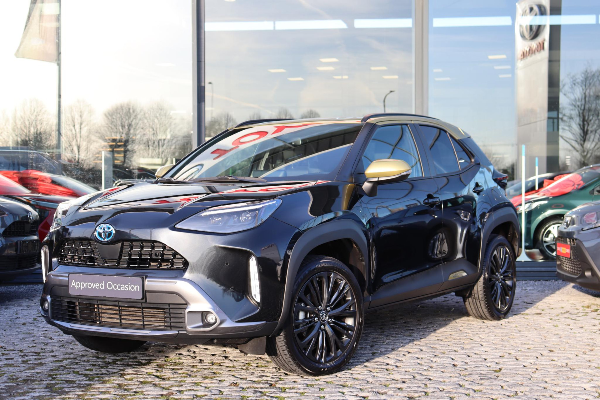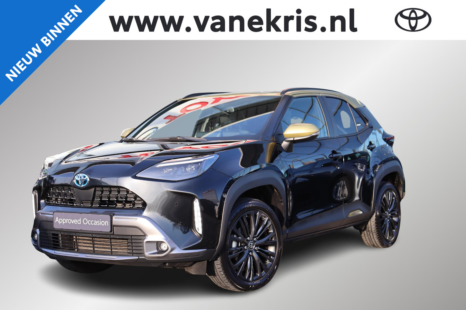 Yaris Cross 1.5 Hybrid 116 PK Adventure in de opvallende Bitone lak Night Sky Black metallic /Brass Gold dak. Deze Cross is voorzien van Head up display, Blind spot monitor, stuur en stoelverwarming, voorruitverwarming (onderzijde), parkeersensoren voor en achter, JBL audio,