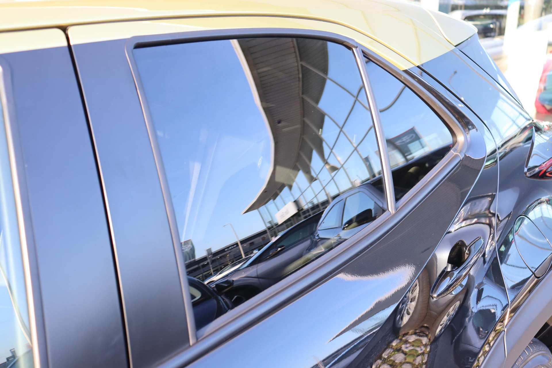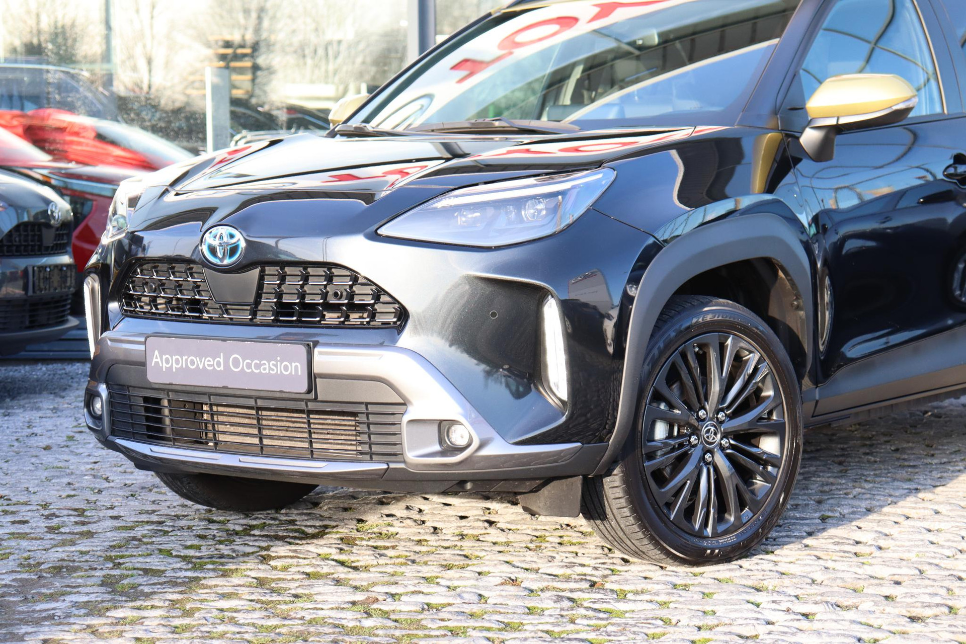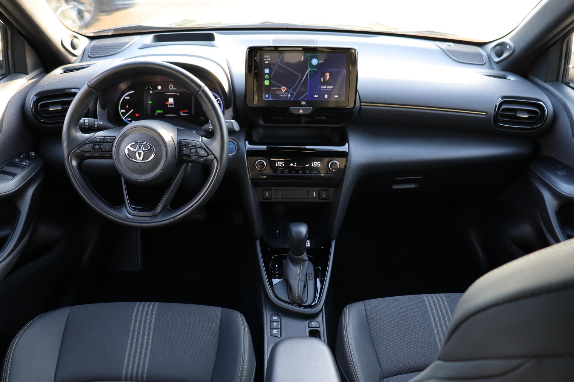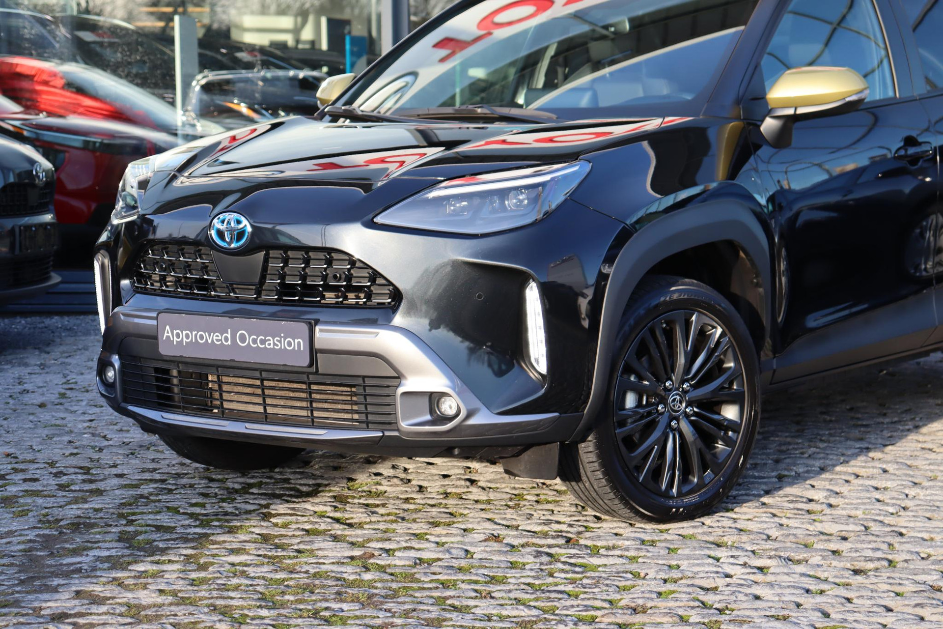 Yaris Cross 1.5 Hybrid 116 PK Adventure in de opvallende Bitone lak Night Sky Black metallic /Brass Gold dak. Deze Cross is voorzien van Head up display, Blind spot monitor, stuur en stoelverwarming, voorruitverwarming (onderzijde), parkeersensoren voor en achter, JBL audio,