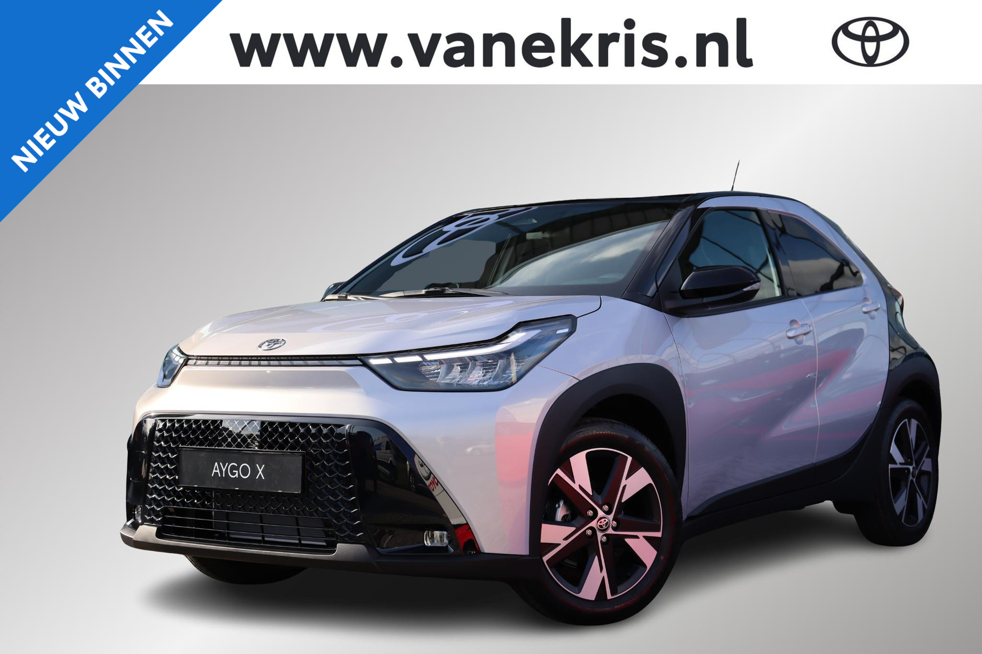 Prachtige Aygo X Hybrid Pulse in de exclusieve kleur Jasmin Silver met het prachtige Bi-Tone Zwarte dak .